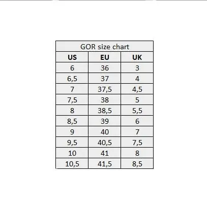 EU 36 US 6.0 UK 3.0 | 23.5 cm EU 37 US 6.5 UK 4.0 | 24.5 cm EU 38 US 7.5 UK 5.0 | 25.0 cm EU 39 US 8.5 UK 6.0 | 25.5 cm EU 40 US 9.0 UK 7.0 | 26.0 cm EU 41 US 10 UK 8.0 | 26.5 cm