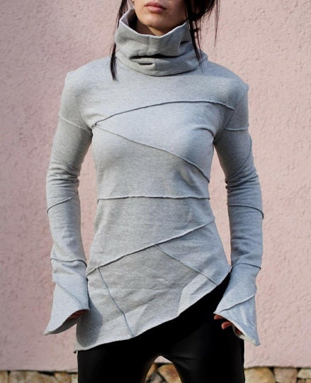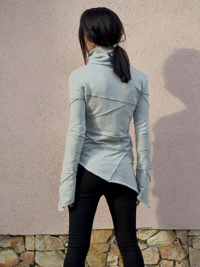 Elevate your wardrobe with this grey asymmetric women s top with long sleeves. The modern asymmetric cut brings contemporary elegance and subtle sculptural detail, making it a versatile choice for both everyday wear and special occasions.